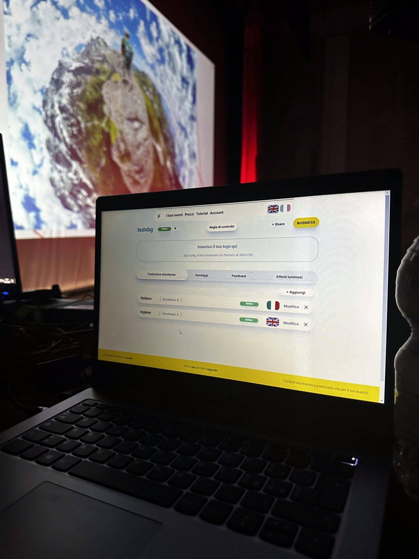 Piattaforma proprietaria che combina traduzione simultanea, sondaggi interattivi e sincronizzazione di effetti luminosi in tempo reale. Ideale per conferenze, fiere e grandi eventi internazionali. Disponibile con noleggio di hardware dedicato o come servizio cloud integrato con il tuo evento.